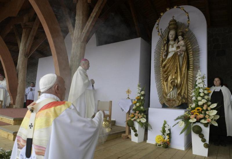 «Siamo pellegrini. Qui, ogni anno, il sabato di Pentecoste, voi vi recate in pellegrinaggio per onorare il voto dei vostri antenati e per fortificare la fede in Dio e la devozione alla Madonna, raffigurata nella monumentale statua lignea. Questo pellegrinaggio annuale appartiene all’eredità della Transilvania, ma onora insieme le tradizioni religiose rumena e ungherese; vi partecipano anche fedeli di altre confessioni ed è un simbolo di dialogo, unità e fraternità; un appello a recuperare le testimonianze di fede divenuta vita e di vita fattasi speranza. Pellegrinare è sapere che veniamo come popolo alla nostra casa. È sapere che abbiamo coscienza di essere popolo».